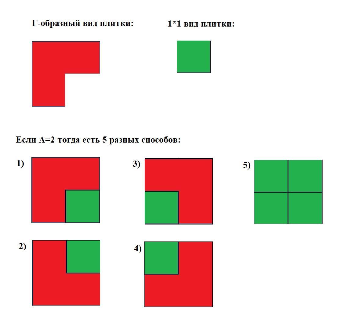 Для решения данной задачи можно использовать динамическое программирование. Создадим массив dp размера A+1, где dp[i] будет хранить количество способов вымостить коридор длины i. Изначально все элементы dp установим в 0.