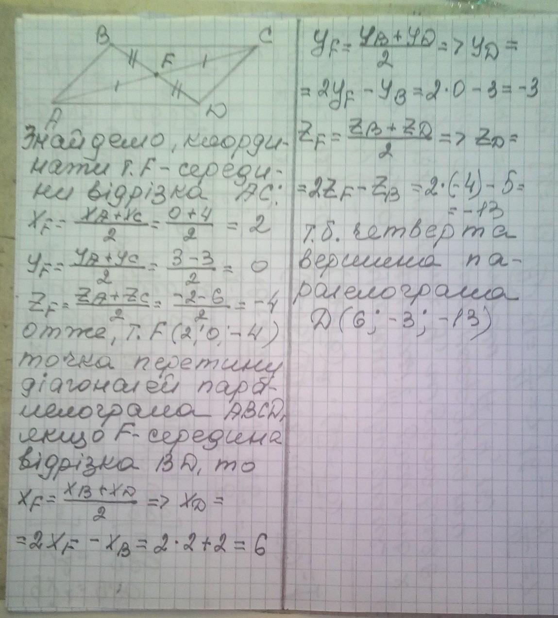 Знайдіть координати четвертої вершини паралело- грама ABCD, якщо дано координати трьох вершин A(0; 3; -2); B(-2; 3; 5); C(4; -3;-6).