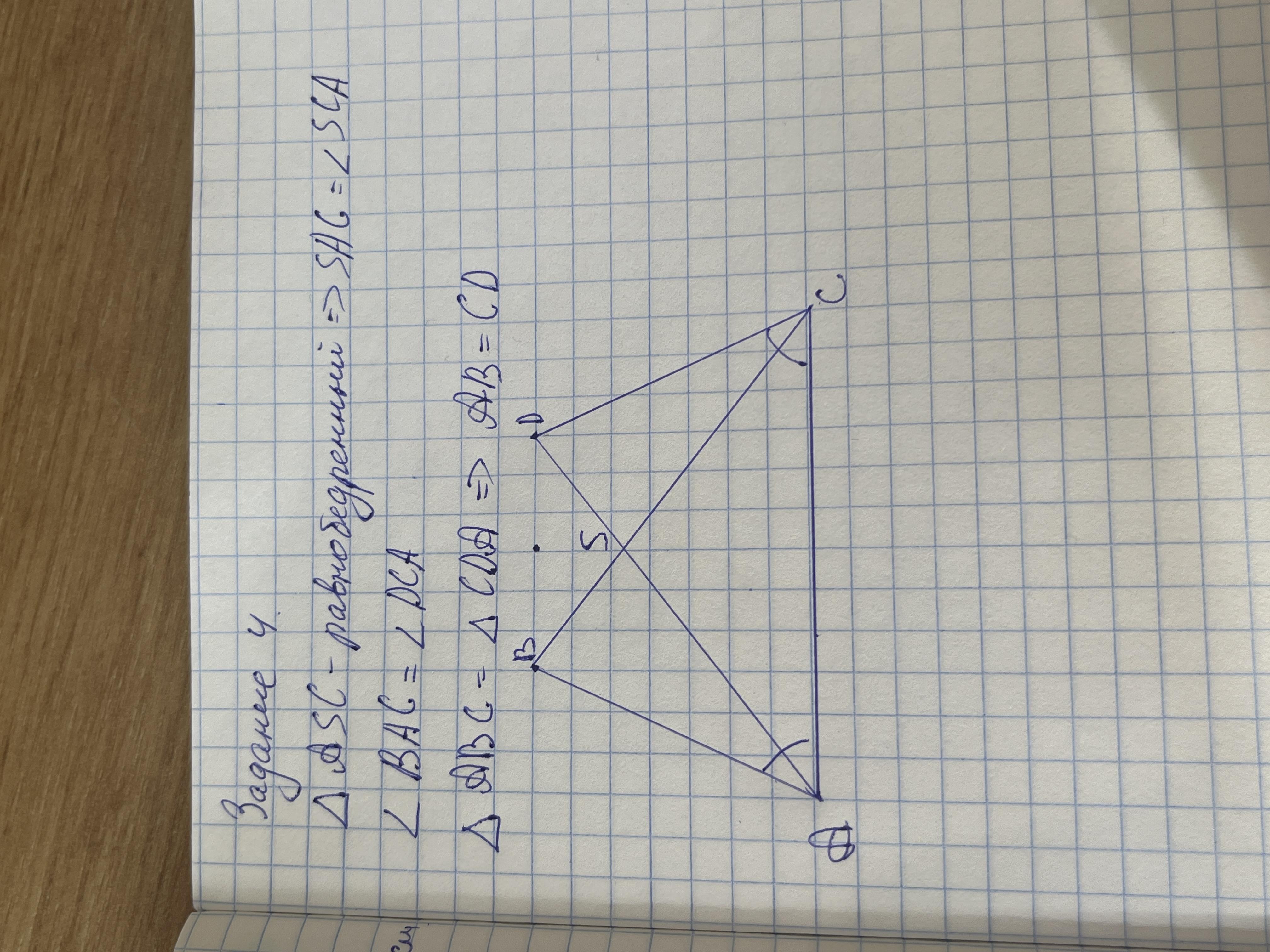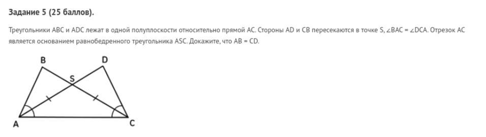 Треугольники ABC и ADC лежат в одной полуплоскости относительно прямой AC. Стороны AD и CB пересекаются в точке S, ∠BAC = ∠DCA. Отрезок AC является основанием равнобедренного треугольника ASC. Докажите, что AB = СD.
