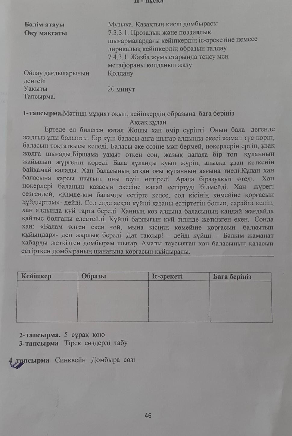 1-тапсырмаға байланысты сұраған сорауына жауап берейін: Кейiпкер - Жошы хан. Образы - Жошы ханның образы оның өмiр суретiне және оның баласымен өзара мунайшаттылу кезiнде көрсетiледi.