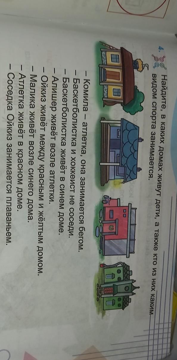 Найдите, в каких домах живут дети, а также кто из них каким- видом спорта занимается.