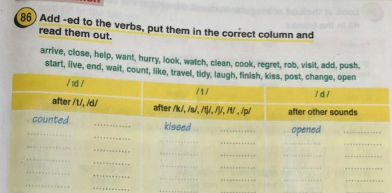 /t/: helped, looked, watched, cooked, pushed, liked, laughed, finished, kissed.