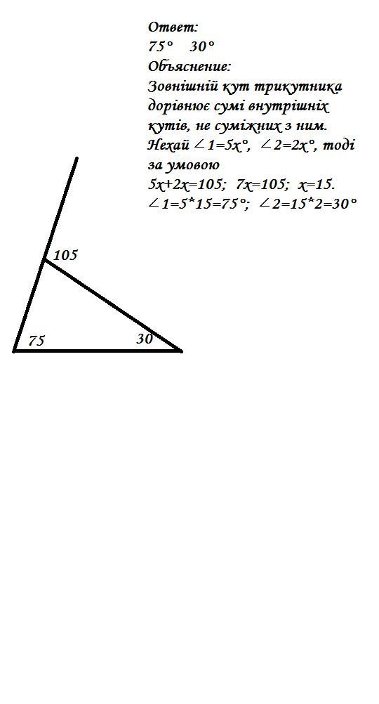 105 знайдіть внутрішні кутм не суміжні з ним якщо вони відносятся як 5:2 Терміново !!!!!