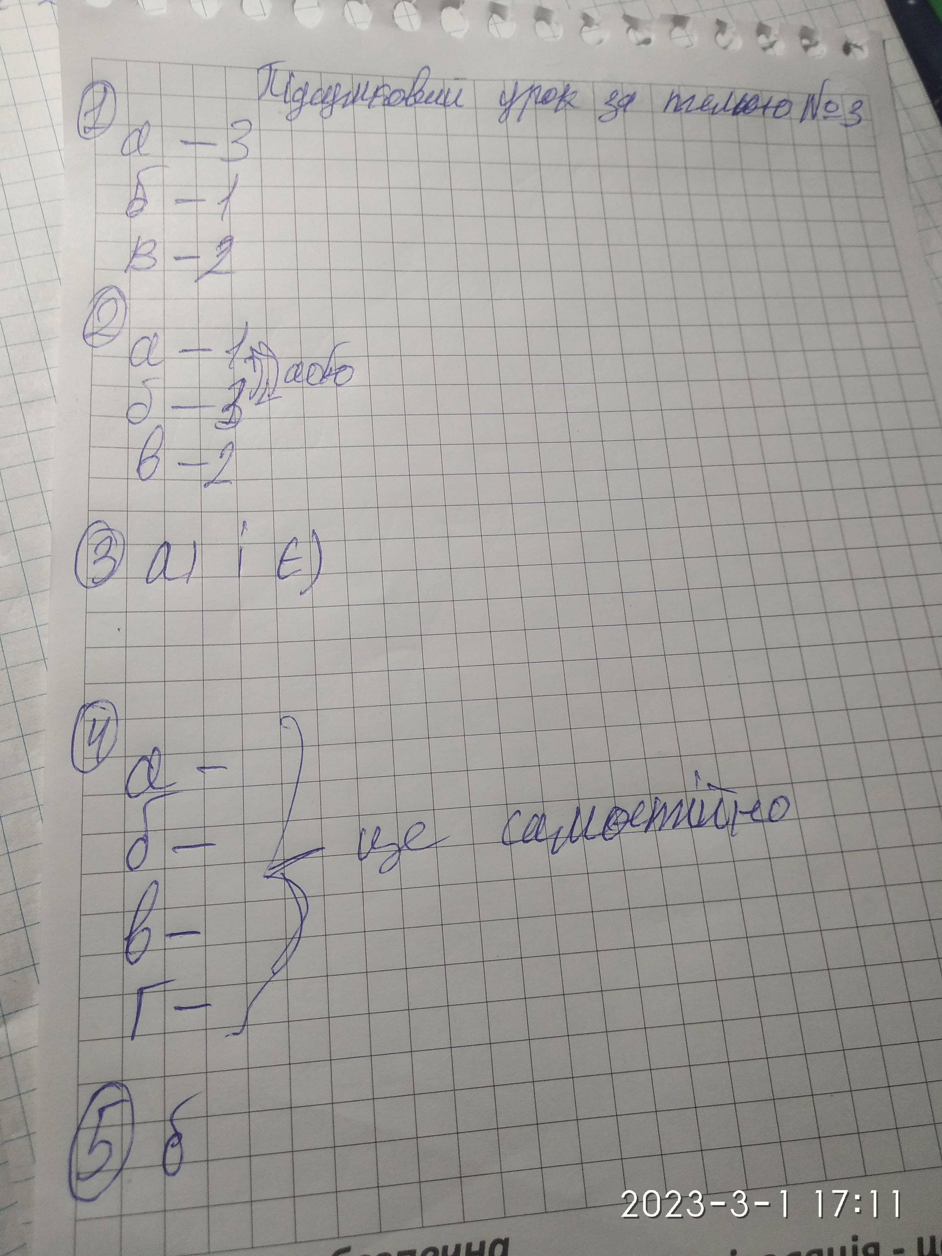 Я не супер геній но щось вголові осталось ми перед чим це сама проходили і точно не уверена що воно правильно но 1 , 3 , 5 правильно а шосте ти і сама справився