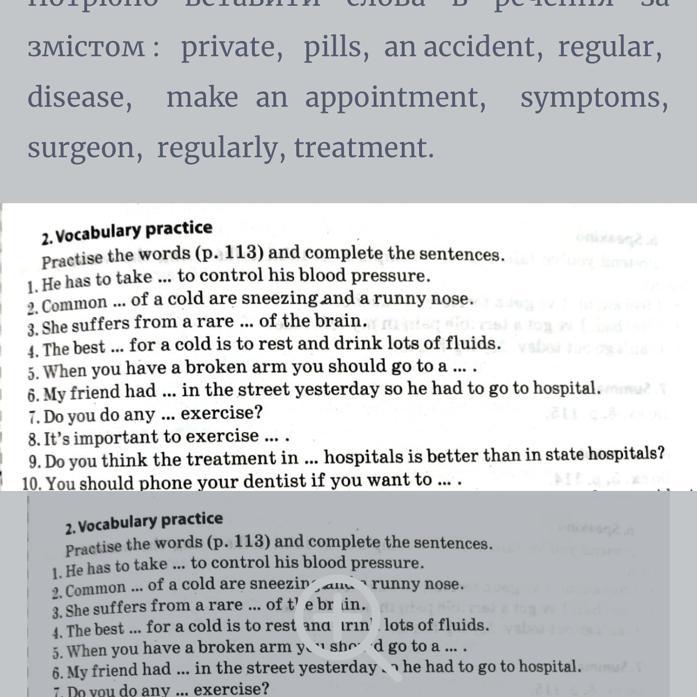 Потрібно вставити слова в речення за змістом : private, pills, an accident, regular, disease, make an appointment, symptoms, surgeon, regularly, treatment.