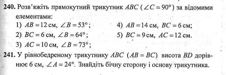 241. У рівнобедреному трикутнику ABC (AB = ВС) висота BD дорів- нює 6 см, <A=24°. Зайдіть бічну сторону і основу трикутника.