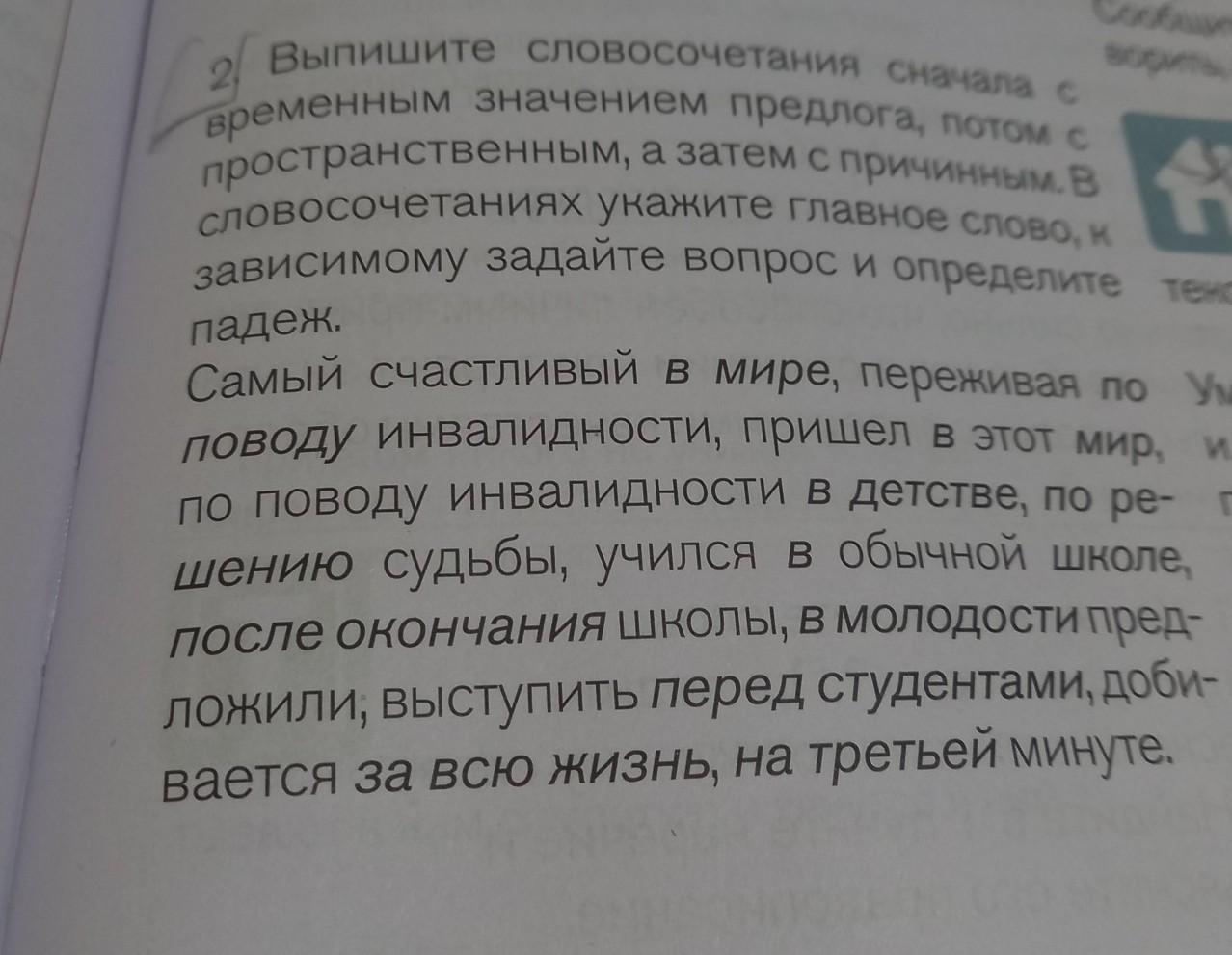Выпишите словосочетания сначала с временным значением предлога, потом с пространственным, а затем с причинным. В словосочетаниях укажите главное слово, к зависимому задайте вопрос и определите ворит тек падеж. Г Самый счастливый в мире, переживая по У поводу инвалидности, пришел в этот мир, и по поводу инвалидности в детстве, по ре- шению судьбы, учился в обычной школе, после окончания школы, в молодости пред- ложили, выступить перед студентами, доби- вается за всю жизнь, на третьей минуте.