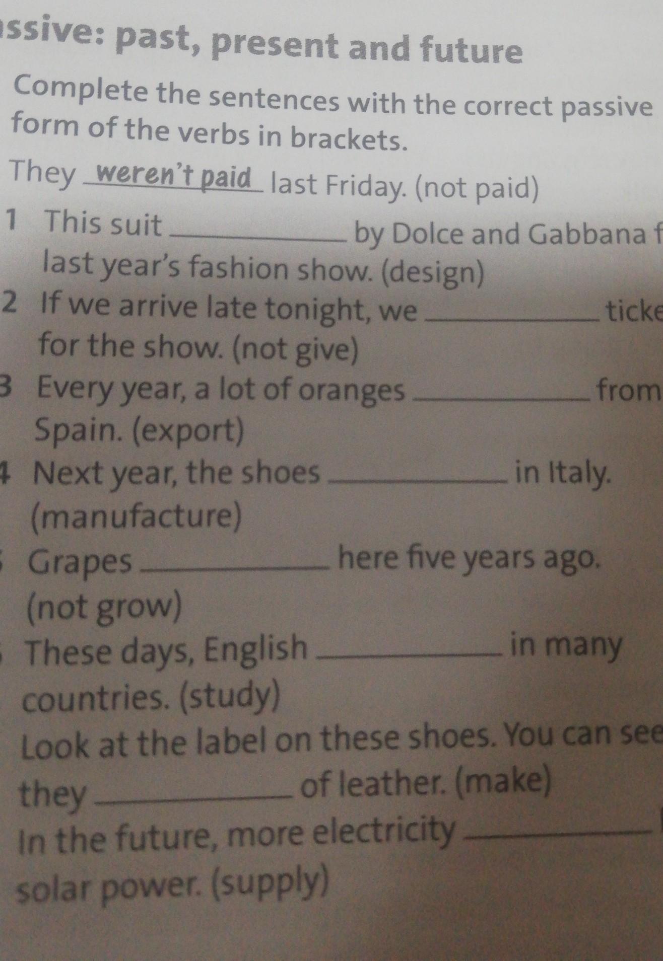 Passive: past, present and future 4 Complete the sentences with the correct passive form of the verbs in brackets. They weren't paid last Friday. (not paid) 1 This suit by Dolce and Gabbana for last year's fashion show. (design) 2 If we arrive late tonight, we for the show. (not give) 3 Every year, a lot of oranges Spain. (export) 4 Next year, the shoes (manufacture) 5 Grapes (not grow) 6 These days, English tickets from in Italy. here five years ago. in many countries. (study) 7 Look at the label on these shoes. You can see that of leather. (make) they- 8 In the future, more electricity solar power. (supply) by