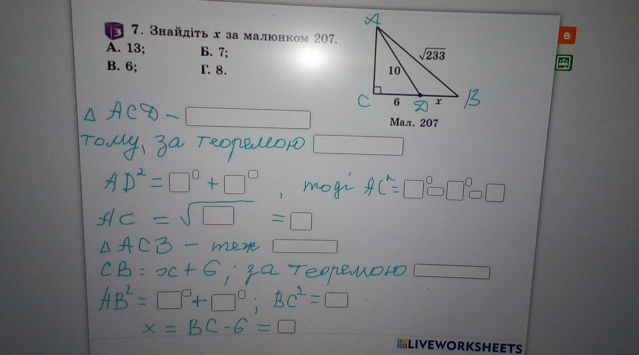 2) У ∆ABC (∠C = 90°; AC = 8; AB = √233; CB = CD+DB = x+6)