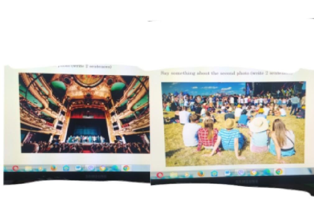 пояснення: 1. On the first picture we can see an awsome theater. There are so many people sitting an watching the concert. Maybe it will be some opera, or maybe it is just some drama show. There are green seats on thr balcony, it is like VIP zone for VIP clients, other pepople should stay all the time, or maybe there are some seats, but I can not see them. There is the beatiful, big scene, and on this scene are some people. It should be actors, who playes this show. Also we can see a blue curtain behind them.
