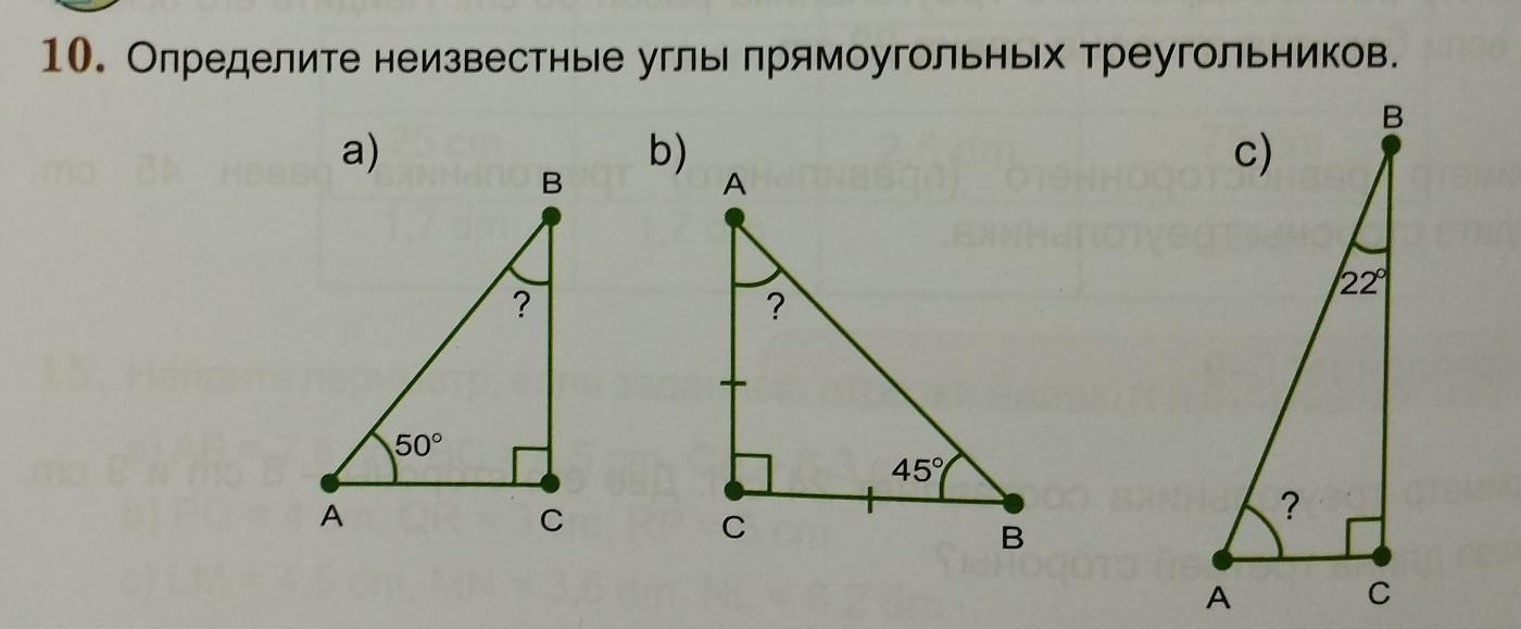 10. Определите неизвестные углы прямоугольных треугольников. ДАЮЮЮ 15 БАЛЛОООООВ ПОЖАЛУЙСТА