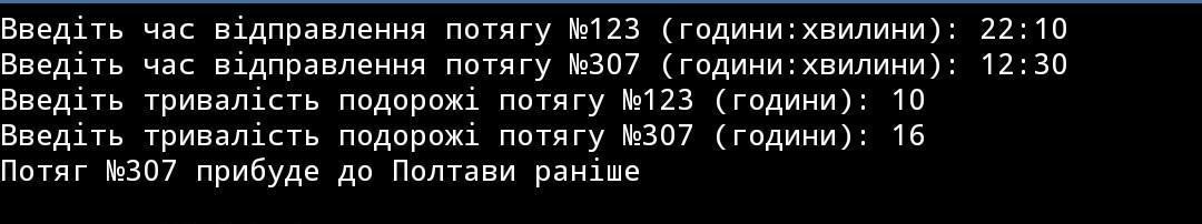 train_123_duration = int(input("Введіть тривалість подорожі потягу №123 (години): "))