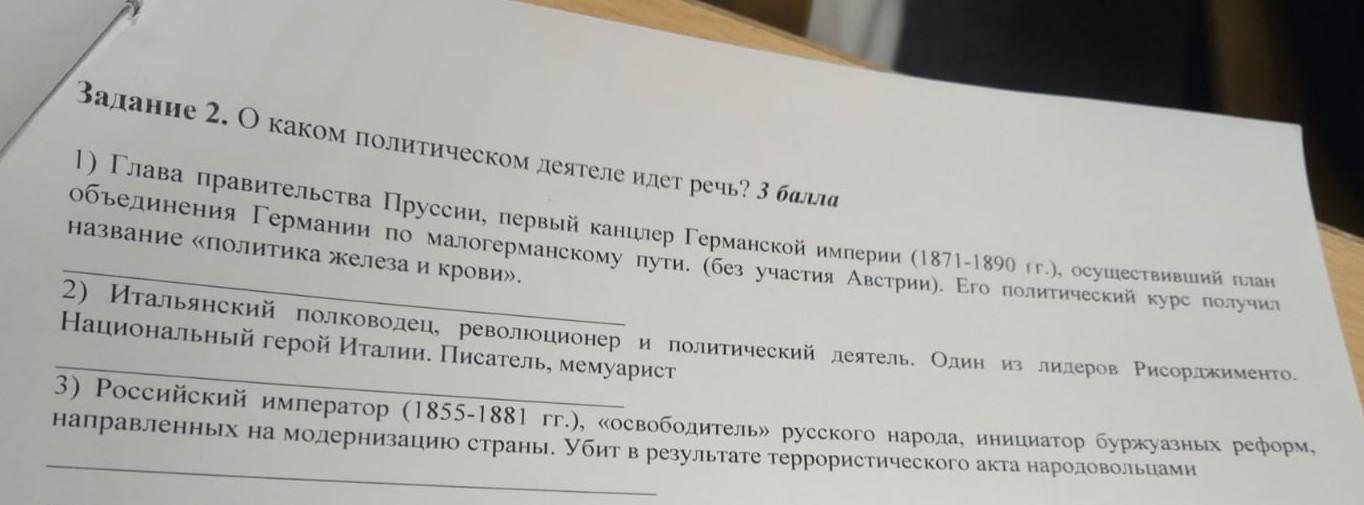 Задание 2. О каком политическом деятеле идет речь? 3 балла 1) Глава правительства Пруссии, первый канцлер Германской империи (1871-1890 гг.), осуществивший план объединения Германии по малогерманскому пути. (без участия Австрии). Его политический курс получил название «политика железа и крови». 2) Итальянский полководец, революционер и политический деятель. Один из лидеров Рисорджименто- Национальный герой Италии. Писатель, мемуарист 3) Российский император (1855-1881 гг.), «освободитель» русского народа, инициатор буржуазных реформ, направленных на модернизацию страны. Убит в результате террористического акта народовольцами