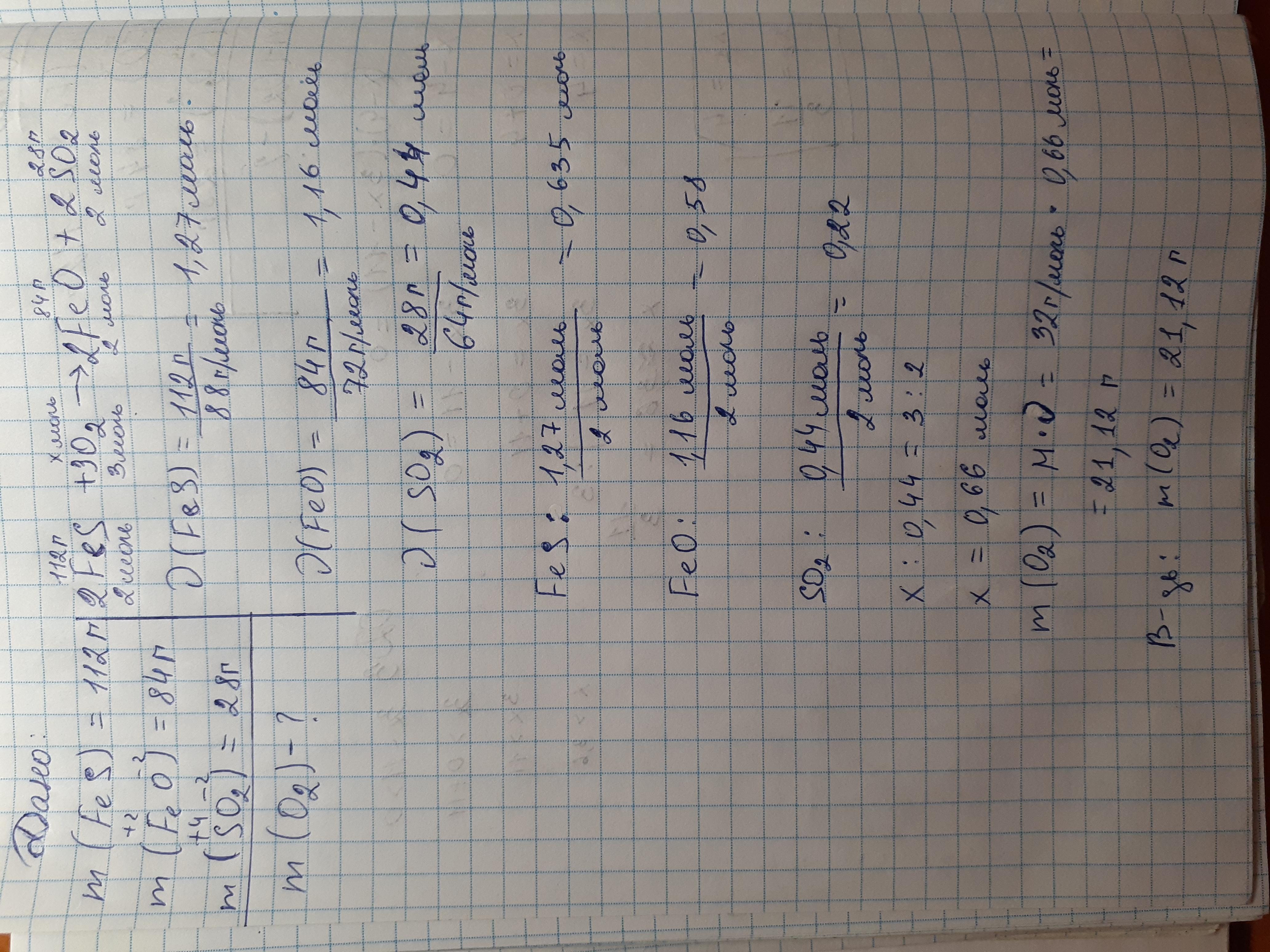 При спалюванні пиріту (FeS) масою 112 г утворилися ферум(II) оксид масою 84 г і сульфур(IV) оксид масою 28 г. Складіть рівняння цєї реакції та обчисліть масу кисню. СРОЧНО!