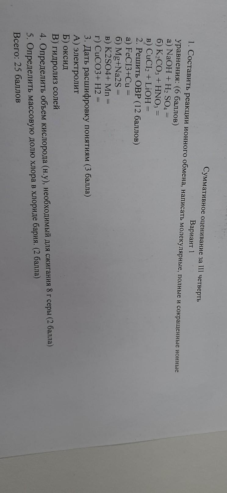 Суммативное оценивание за III четверть Вариант 1 1. Составить реакции ионного обмена, написать молекулярные, полные и сокращенные ионные уравнения: (6 баллов) a) NaOH + H2 SO4 = б) K2CO3 + HNO3 = B) CuCl2 + LiOH = 2. Решить ОВР (12 баллов) a) FeCI3+Cu = б) Mg+Na2S= в) K2SO4+ Mn = г) CuCO3+ Н2 = 3. Дать расшифровку понятиям (3 балла) А) электролит Б) оксид в) гидролиз солей 4. Определить объем кислорода (н.у), необходимый для сжигания 8 г серы (2 балла) 5. Определить массовую долю хлора в хлориде бария. (2 балла) Всего: 25 баллов