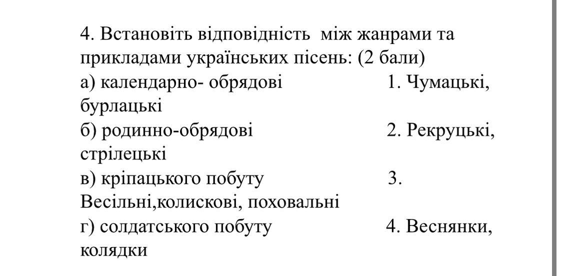 Встановіть відповідність між жанрами та прикладами українських пісень: а) календарно- обрядові 1. Чумацькі, бурлацькі