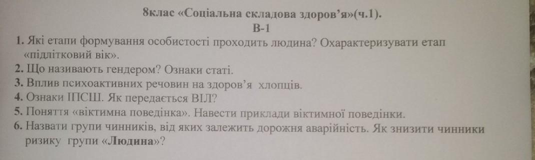 8клас «Соціальна складова здоров'я»(ч.1). B-1 1. Які етапи формування особистості проходить людина? Охарактеризувати етап «підлітковий вік». 2. що називають гендером? Ознаки статі. 3. Вплив психоактивних речовин на здоров'я хлопців. 4. Ознаки ІПСШ. Як передається ВІЛ? 5. Поняття «віктимна поведінка». Навести приклади віктимної поведінки. 6. Назвати групи чинників, від яких залежить дорожня аварійність. Як знизити чинники ризику групи