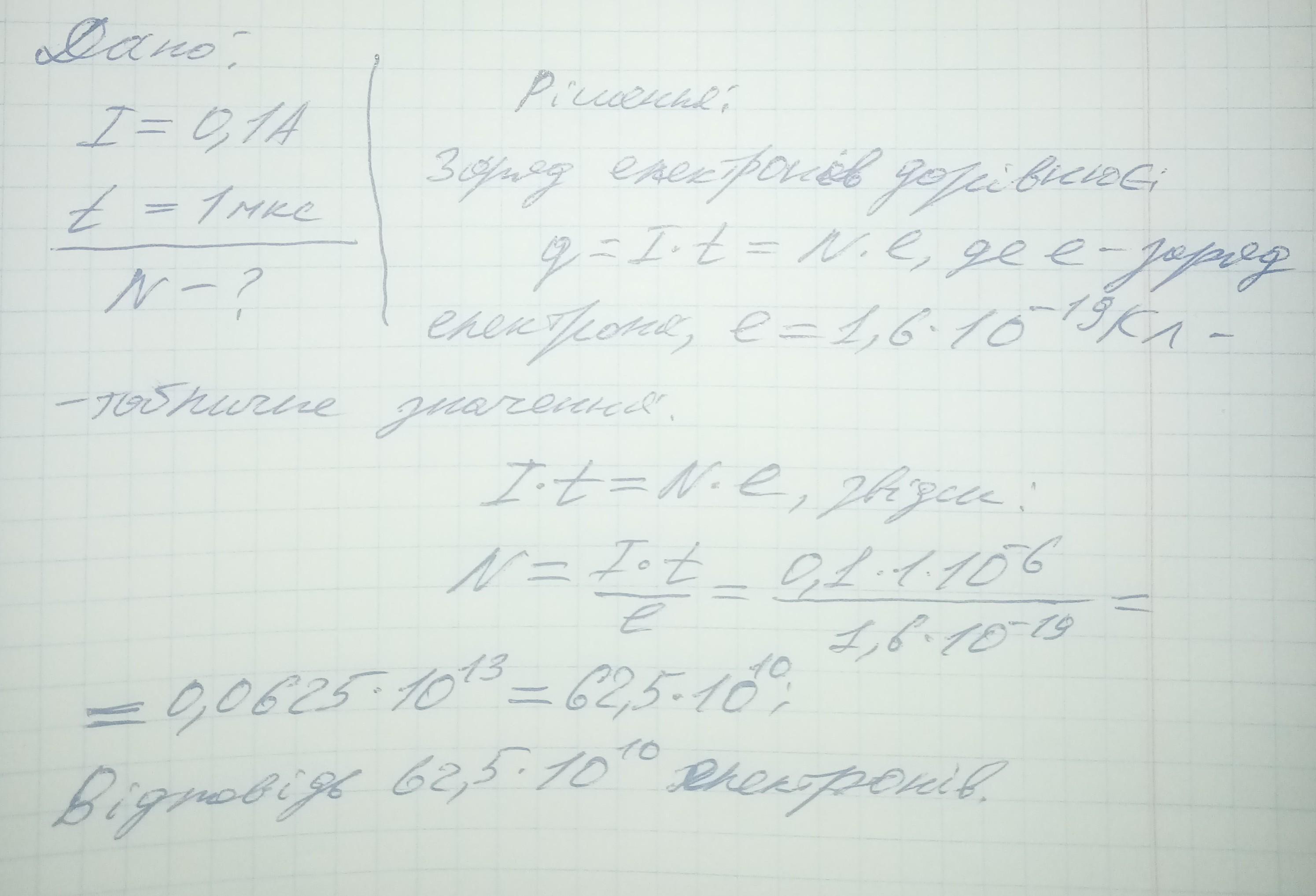 Струм, сила якого дорівнює 100 мА, спричинює фібриляцію зупинку серця людини. Скільки електронів за 1 мкс проходить через серце в цьому випадку?