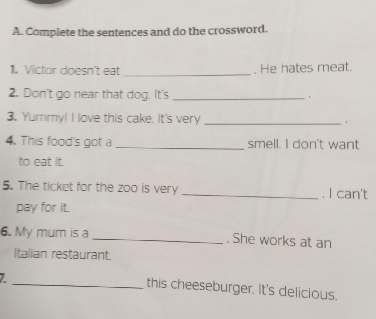 A. Complete the sentences and do the crossword. 1. Victor doesn't eat 2. Don't go near that dog. It's 3. Yummy! I love this cake. It's very 4. This food's got a to eat it. 5. The ticket for the zoo is very pay for it. 7. 6. My mum is a Italian restaurant. He hates meat smell. I don't want She works at an this cheeseburger. It's delicious