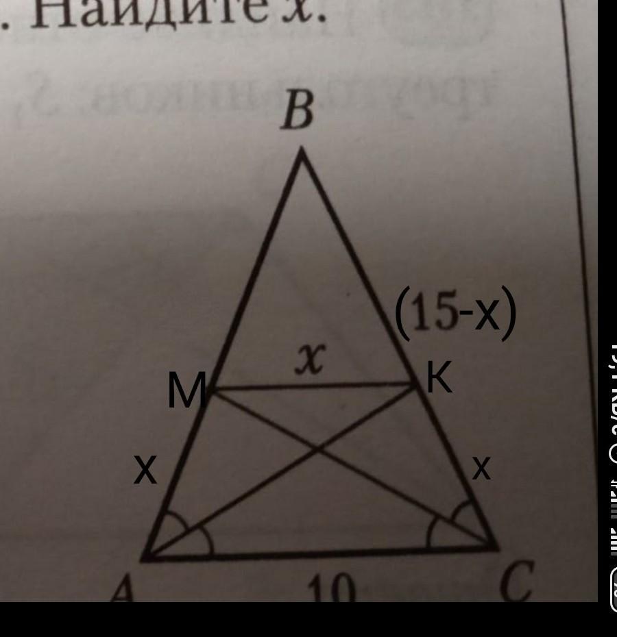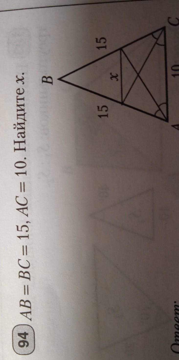 Это все условие? ДЕ параллельно АС? Тогда вс просто: треугольники АВС и ДВЕ подобны по 2 углам, можно записать отношения сходственных сторон. ДЕ : АС = ДВ : АВ, 10 : 15 = (х+6) : ( 2х+6), х=6 - АД, 12 -ВД, АВ = 18 см, ВС=АВ поставь коронку пожайлуста