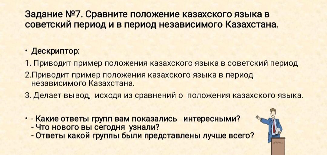 3)Сравнивая положение казахского языка в советский период и в период Независимого Казахстана, можно сделать вывод, что в последние годы казахский язык получил большую поддержку и признание в Казахстане. Правительство Казахстана предпринимает шаги для поддержки и развития казахского языка, в том числе через проведение мероприятий по популяризации казахской культуры и языка. Однако, наряду с этим, в стране все еще широко используется русский язык, который остается важным языком в общественной жизни и в бизнес-сфере.