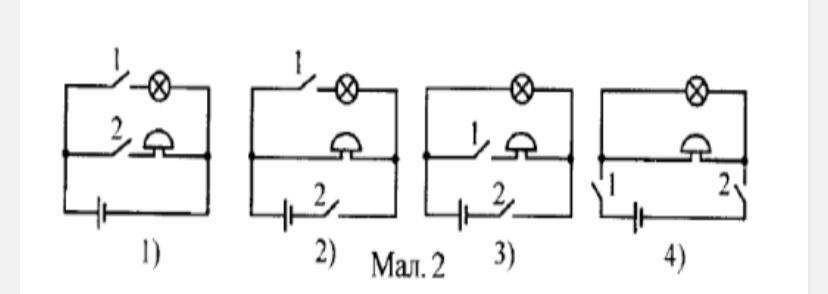 схему кола, в якому при замиканні ключа 2, дзвінок працює, а лампочка не світить?