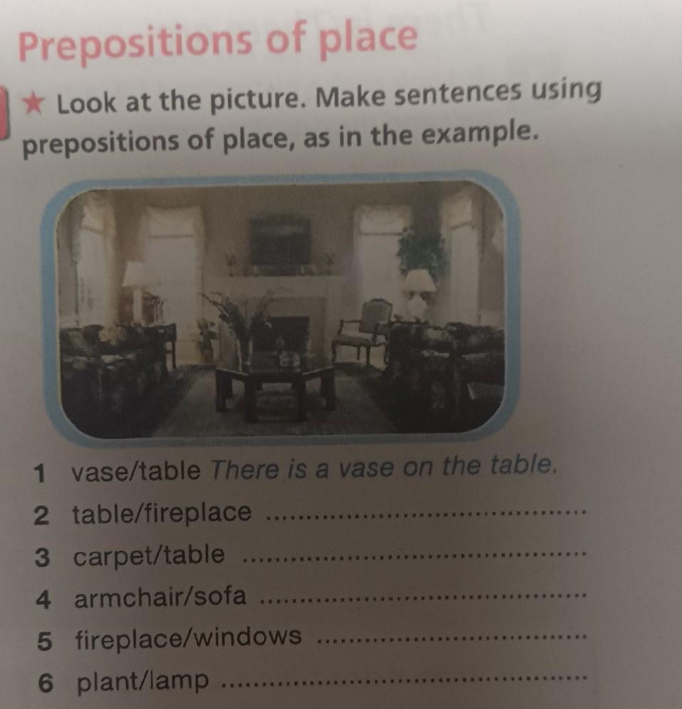 Prepositions of place 4* Look at the picture. Make sentences using prepositions of place, as in the example. 1 vase/table There is a vase on the table. 2 table/fireplace .... 3 carpet/table 4 armchair/sofa 5 fireplace/windows 6 plant/lamp