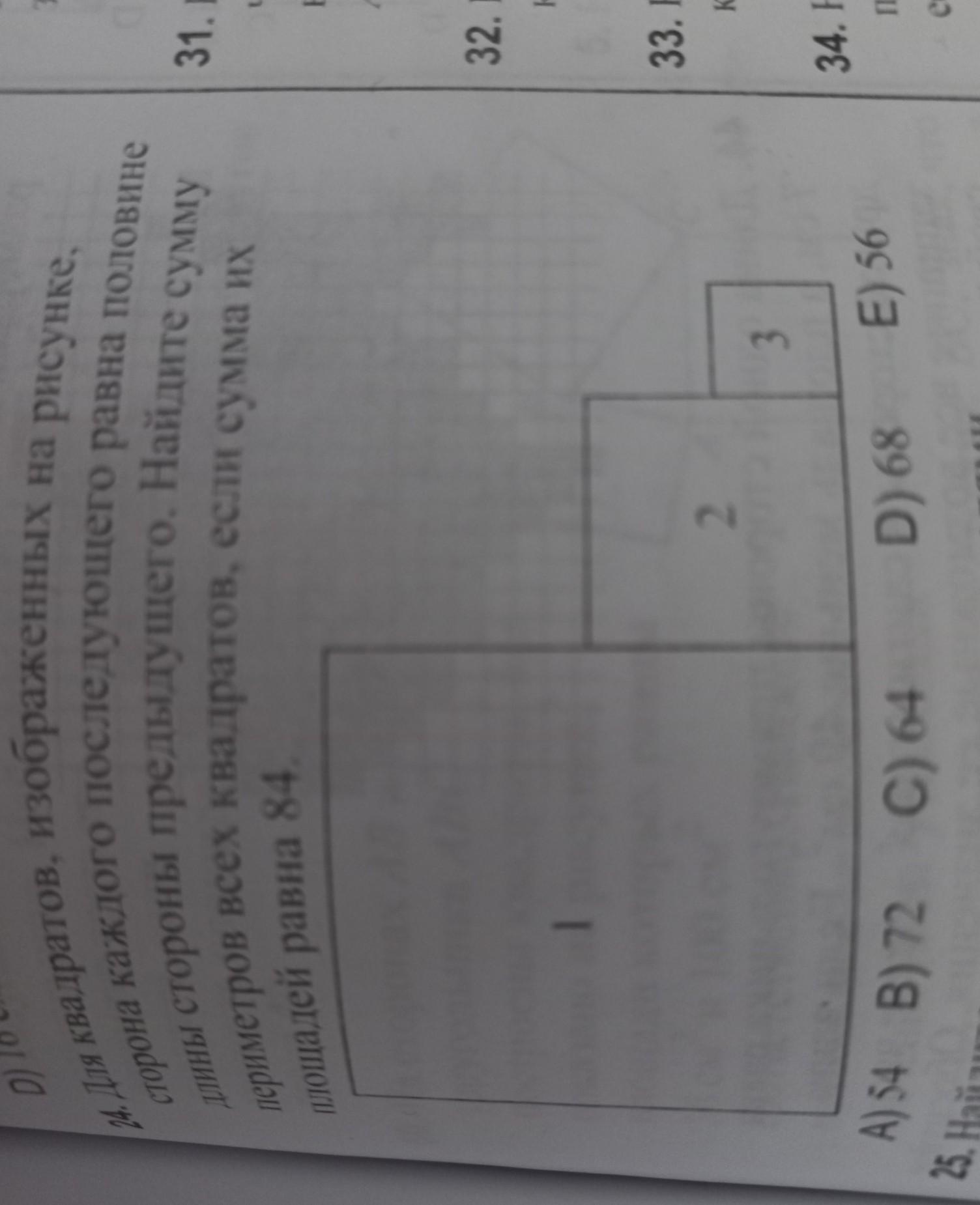 х-сторона наименьшего;2х;4х.Площади: х² ;4х²; 16х². х²+4х²+16х²=84; 21х²=84; х²=4; х=2 стороны: 2; 4; 8; периметры2×4=8; 4×4=16; 8×4 =32; сума 8+16+32=56 ответ:Е