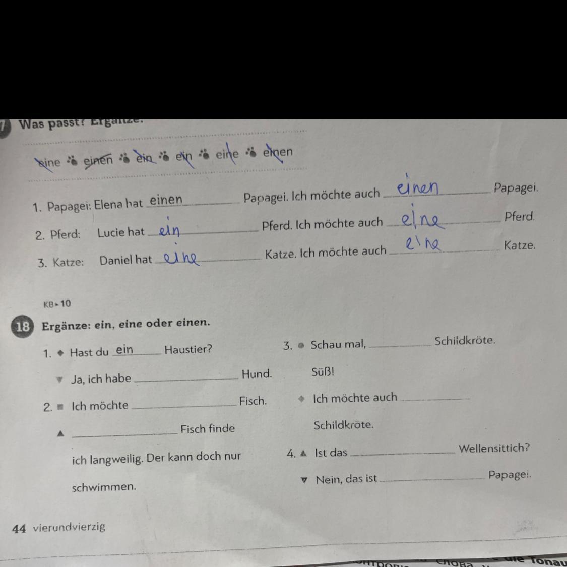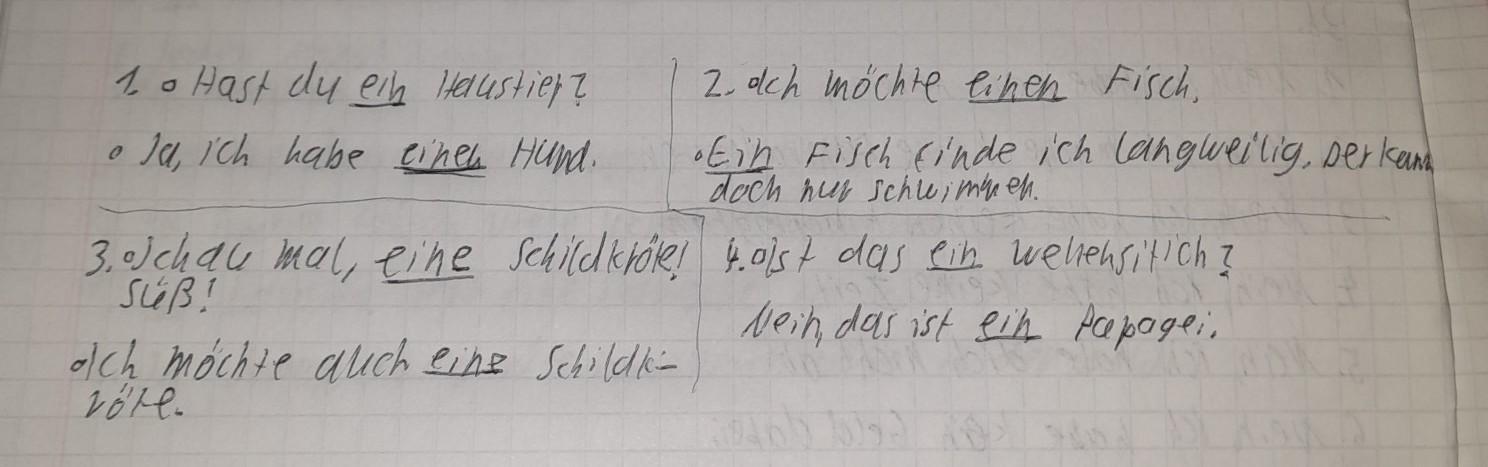 Ein Hund; eine Fisch; eine Schildkröte; ein Wellensittich; ein Papagei