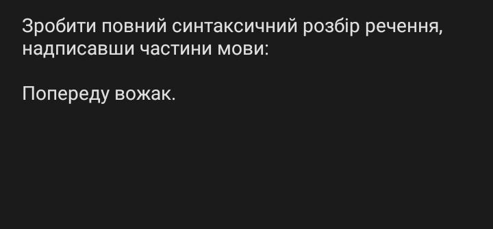 Попереду вожак — попереду(обставина (де?)) вожак(іменник (хто))