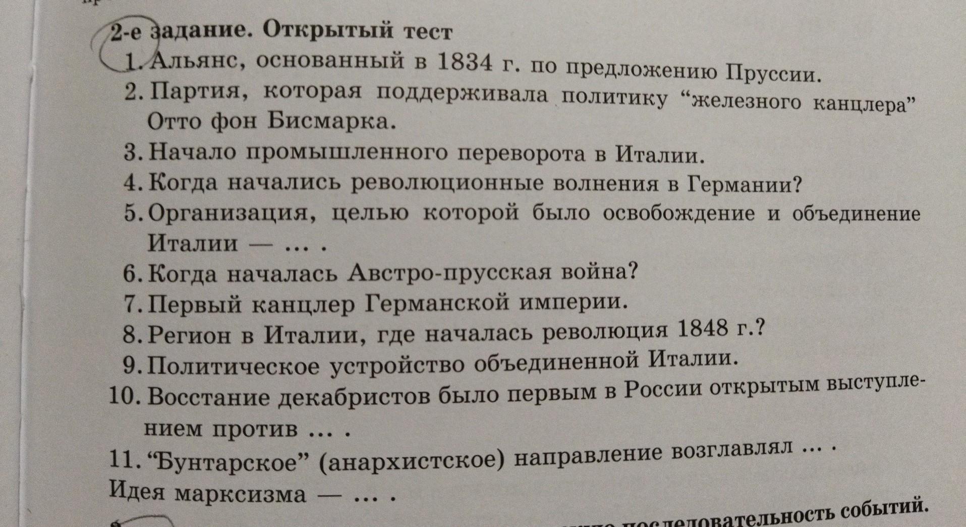 2-е задание. Открытый тест 1. Альянс, основанный в 1834 г. по предложению Пруссии. 2. Партия, которая поддерживала политику "железного канцлера" Отто фон Бисмарка. 3. Начало промышленного переворота в Италии. 4. Когда начались революционные волнения в Германии, 5. Организация, целью которой было освобождение и объединение Италии 6. Когда началась Австро-прусская война? 7. Первый канцлер Германской империи. 8. Регион в Италии, где началась революция 1848 г.? .... 9. Политическое устройство объединенной Италии. 10. Восстание декабристов было первым в России открытым выступле- нием против 11. "Бунтарское" (анархистское) направление возглавлял ... . Идея марксизма ....
