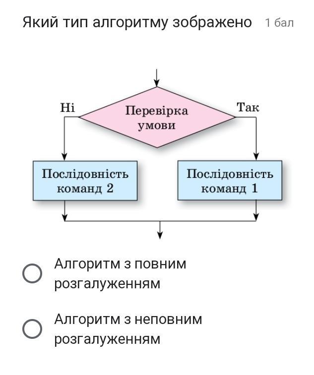 Це алгоритм з повним розгалуженням, оскільки він містить варіанти команд після обох умов.