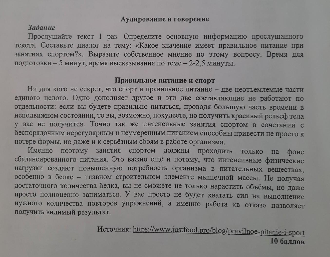 Аудирование и говорение Задание Прослушайте текст 1 раз. Определите основную информацию прослушанного текста. Составьте диалог на тему: «Какое значение имеет правильное питание при занятиях спортом?». Выразите собственное мнение по этому вопросу. Время для подготовки - 5 минут, время высказывания по теме - 2-2,5 минуты. - - Правильное питание и спорт две неотъемлемые части Ни для кого не секрет, что спорт и правильное питание единого целого. Одно дополняет другое и эти две составляющие не работают по отдельности: если вы будете правильно питаться, проводя большую часть времени в неподвижном состоянии, то вы, возможно, похудеете, но получить красивый рельеф тела у вас не получится. Точно так же интенсивные занятия спортом в сочетании с беспорядочным нерегулярным и неумеренным питанием способны привести не просто к потере формы, но даже и к серьёзным сбоям в работе организма. - Именно поэтому занятия спортом ДОЛЖНЫ проходить только на фоне сбалансированного питания. Это важно ещё и потому, что интенсивные физические нагрузки создают повышенную потребность организма в питательных веществах, особенно в белке главном строительном элементе мышечной массы. Не получая достаточного количества белка, вы не сможете не только нарастить объёмы, но даже просто полноценно заниматься. У вас просто не будет хватать сил на выполнение нужного количества повторов упражнений, а именно работа «в отказ» позволяет получить видимый результат. -