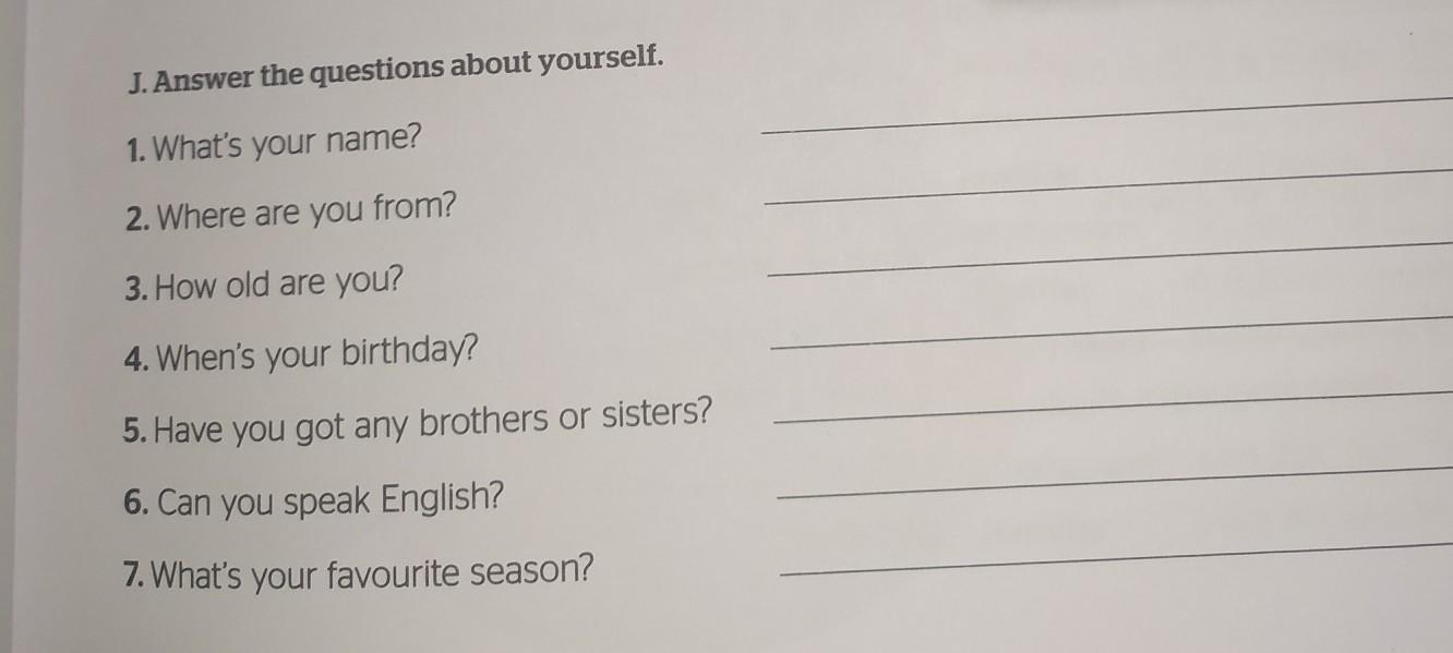 J. Answer the questions about yourself. 1. What's your name? 2. Where are you from? 3. How old are you? 4. When's your birthday? 5. Have you got any brothers or sisters? 6. Can you speak English? 7. What's your favourite season