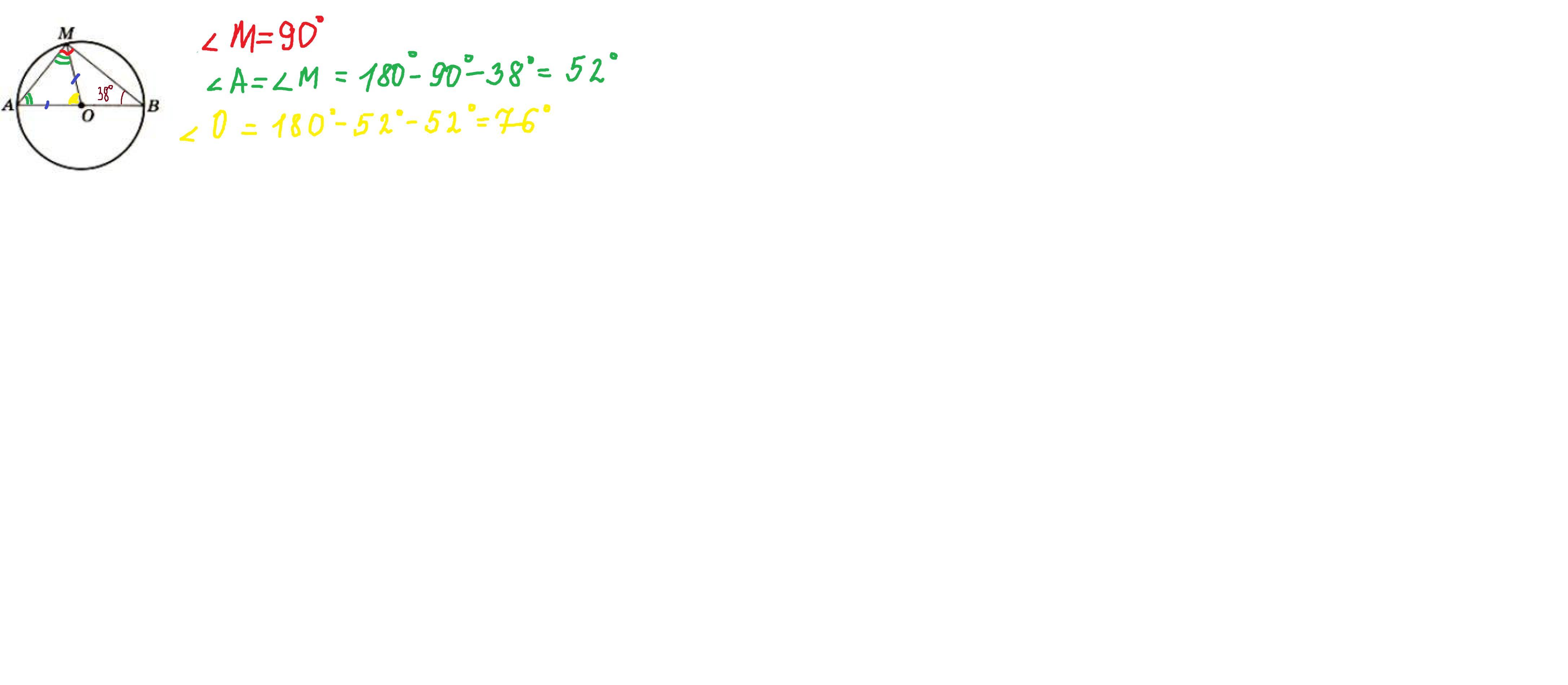 треугольник АОМ равнобедренный,его боковые стороны это два радиуса.В равнобедренном треугольнике углы при основании равны,значит в треугольнике АОМ угол М=52°,потому что равен углу А .