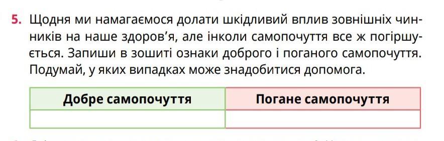 5. Щодня ми намагаємося долати шкідливий вплив зовнішніх чин- ників на наше здоров'я, але інколи самопочуття все ж погіршу- ється. Запиши в зошиті ознаки доброго і поганого самопочуття. Подумай, у яких випадках може знадобитися допомога. Добре самопочуття Погане самопочуття