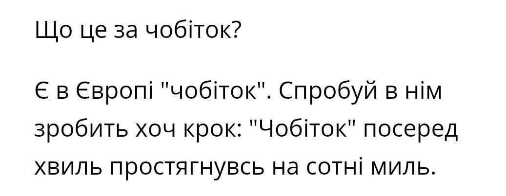 Що це за чобіток? Є в Європі "чобіток". Спробуй в нім зробить хоч крок: "Чобіток" посеред хвиль простягнувсь на сотні миль.