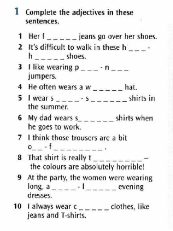 1. fitted, high-heeled, polo-neck, woolly, short-sleeved, striped, old-fashioned, tasteless, knee-length, casual