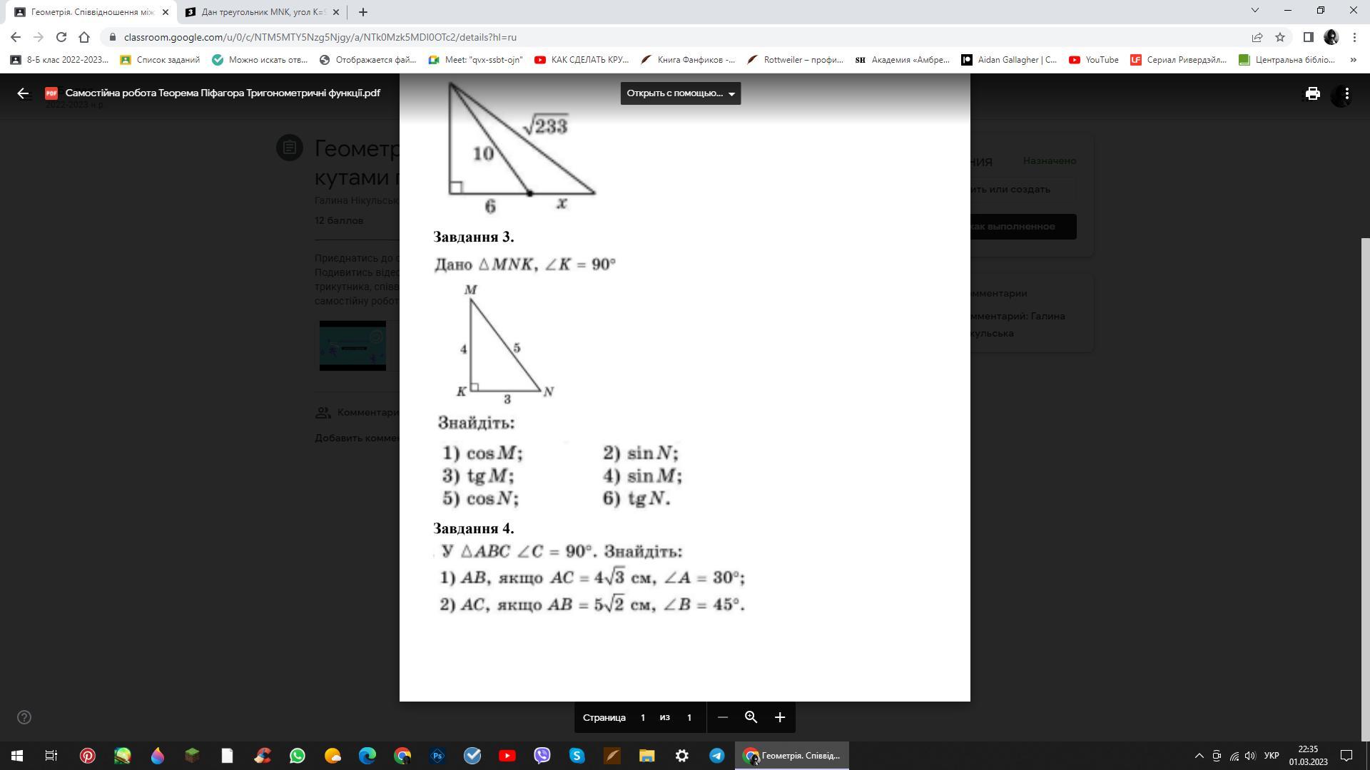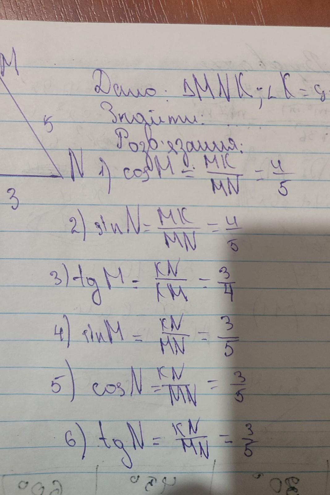 cosM = KM/MN = 4/5. sinN = KM/MN = 4/5. tgM = KN/MK = 3/4. sinM = KN/MN = 3/5. sinM = cosN = KN/MN = 3/5. tgN = MK/KN = 4/3 = 1 1/3