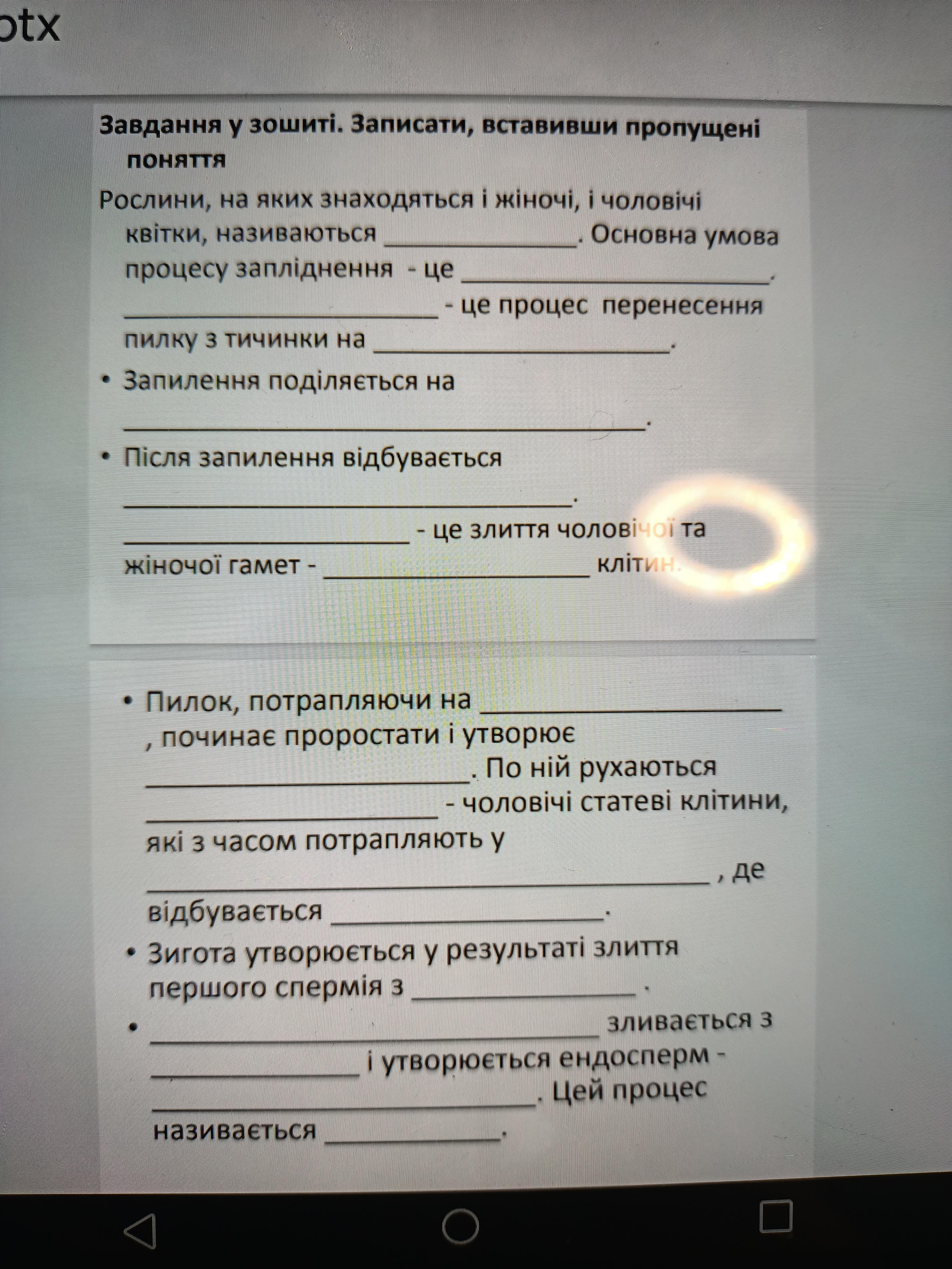 Рослини, на яких знаходяться і жіночі, і чоловічі квітки, називаються однодомними. Основна умова процесу запліднення-це взаємодія гамет та злиття їх генетичного матеріалу. Запилення-це процес перенесення пилку з тичинки на приймочку маточки. Запилення поділяється на: самозапилення та перехресне запилення. Після запилення відбувається процес запліднення -це злиття чоловічої та жіночої гамет статевих клітин. Пилок потрапляючи на приймочку, починає проростати і утворює пилкову трубку. По ній рухаються спермії- чоловічі статеві клітини, які з часом потрапляють у зародковий мішок, де відбувається запліднення.Зигота утворюється у результаті злиття першого спермії- з яйцеклітиною. А інший зливається з центральною клітиною зародкового мішка і утворюється ендосперм- тканина насіння у рослин, у якій відкладаються поживні речовини для розвитку та життя зародка. Цей процес називається подвійне запліднення.