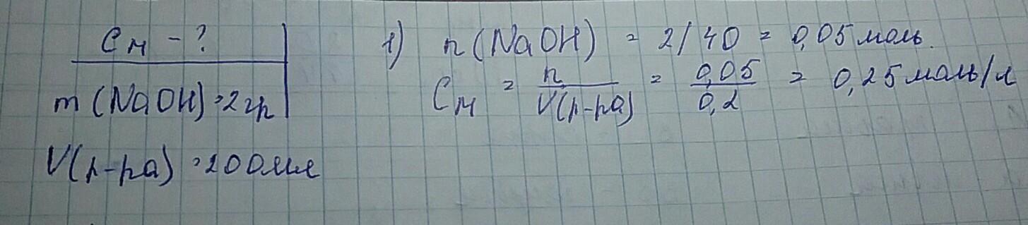 Определите молярную концентрацию раствора, если 2 г гидроксида натрия (NaOH содержится в 200 мл раствора.