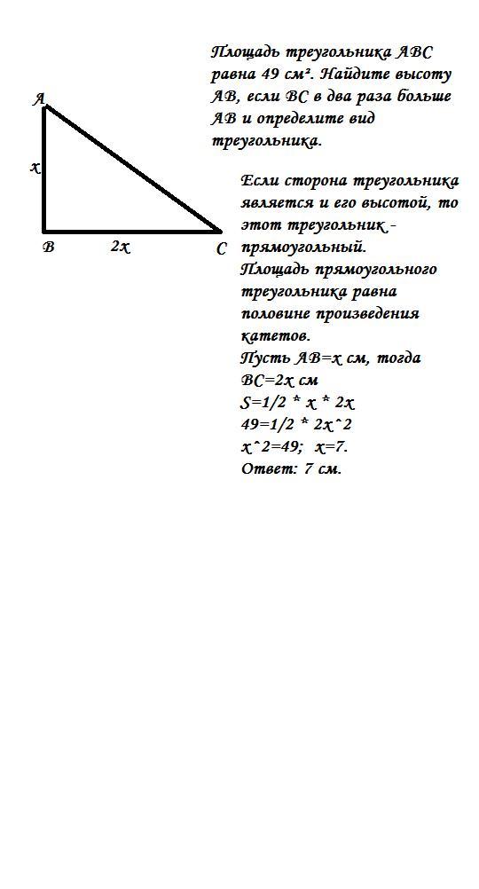 2. Площадь треугольника ABC равна 49 см². Найдите высоту AB, если ВС в два раза больше АВ и определите вид треугольника.