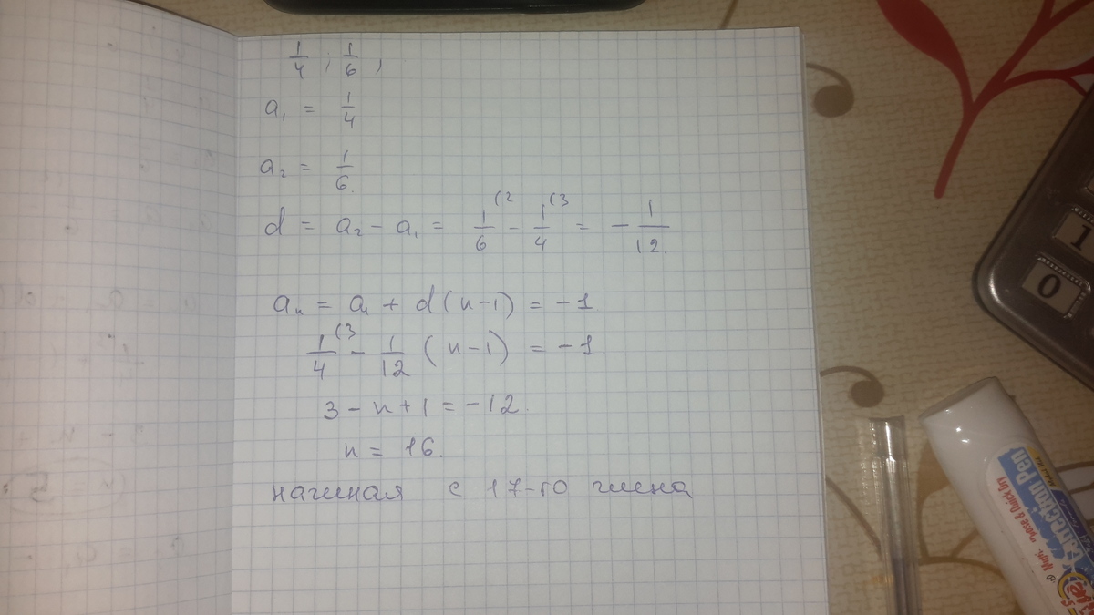 В арифметической прогрессии 1/4; 1/6; ... укажите номер того члена, начиная с которого все члены прогрессии будут меньше -1