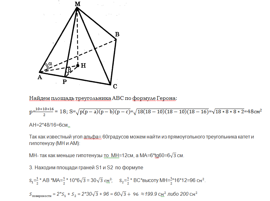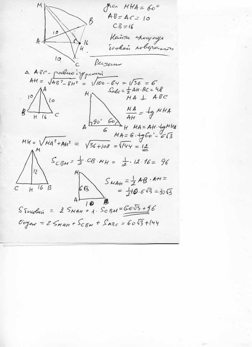 В пирамиде МАВС боковое ребро МА перпендикулярно плоскости основания АВС, а грань МВС составляет с ним угол 60º, АВ=АС=10, ВС=16. Найдите площадь боковой поверхности пирамиды.