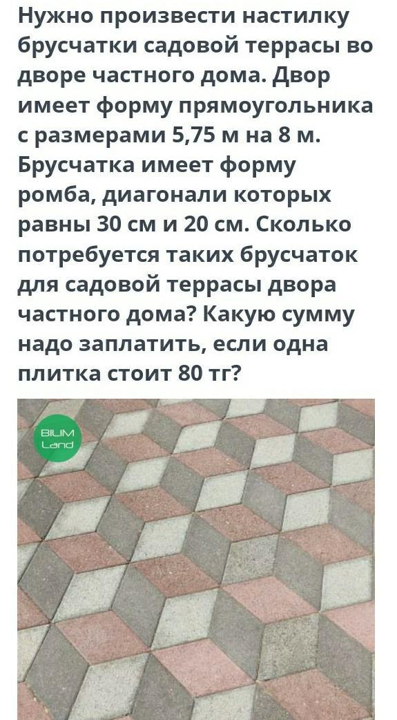 Нужно произвести настилку брусчатки садовой террасы во дворе частного дома. Двор имеет форму прямоугольника с размерами 5,75 м на 8 м. Брусчатка имеет форму ромба, диагонали которых равны 30 см и 20 см. Сколько потребуется таких брусчаток для садовой Teppacb двора частного дома? Какую сумму надо заплатить, если одна плитка стоит 80 тг?