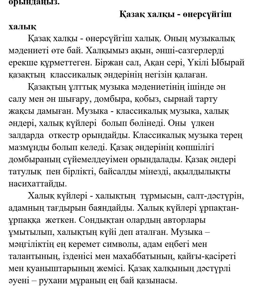 3. Мәтінге сәйкес келетін мақал-мәтелді белгілеңіз. А) Өнерлі өрге жүзеді. С) Музыка – адамзаттың әмбебап тілі. В) Өнерлі істе жеміс бар, Д) Өлеңді қосылып айтқан жақсы, Өрелі істе жеңіс бар. Сөзді тосып айтқан жақсы.