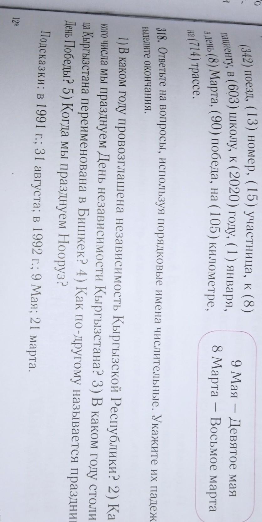 318. Ответьте на вопросы, используя порядковые имена числительные. Укажите их падеж, выделите окончания. 1) В каком году провозглашена независимость Кыргызской Республики? 2) Ка- кого числа мы празднуем День независимости Кыргызстана? 3) В каком году столи- ца Кыргызстана переименована в Бишкек? 4) Как по-другому называется праздник День Победы? 5) Когда мы празднуем Нооруз? Подсказки: в 1991 г.; 31 августа; в 1992 г.; 9 Мая; 21 марта. 12* вот же фото вам не видно или что (нажмите на фото и оно станет больше)