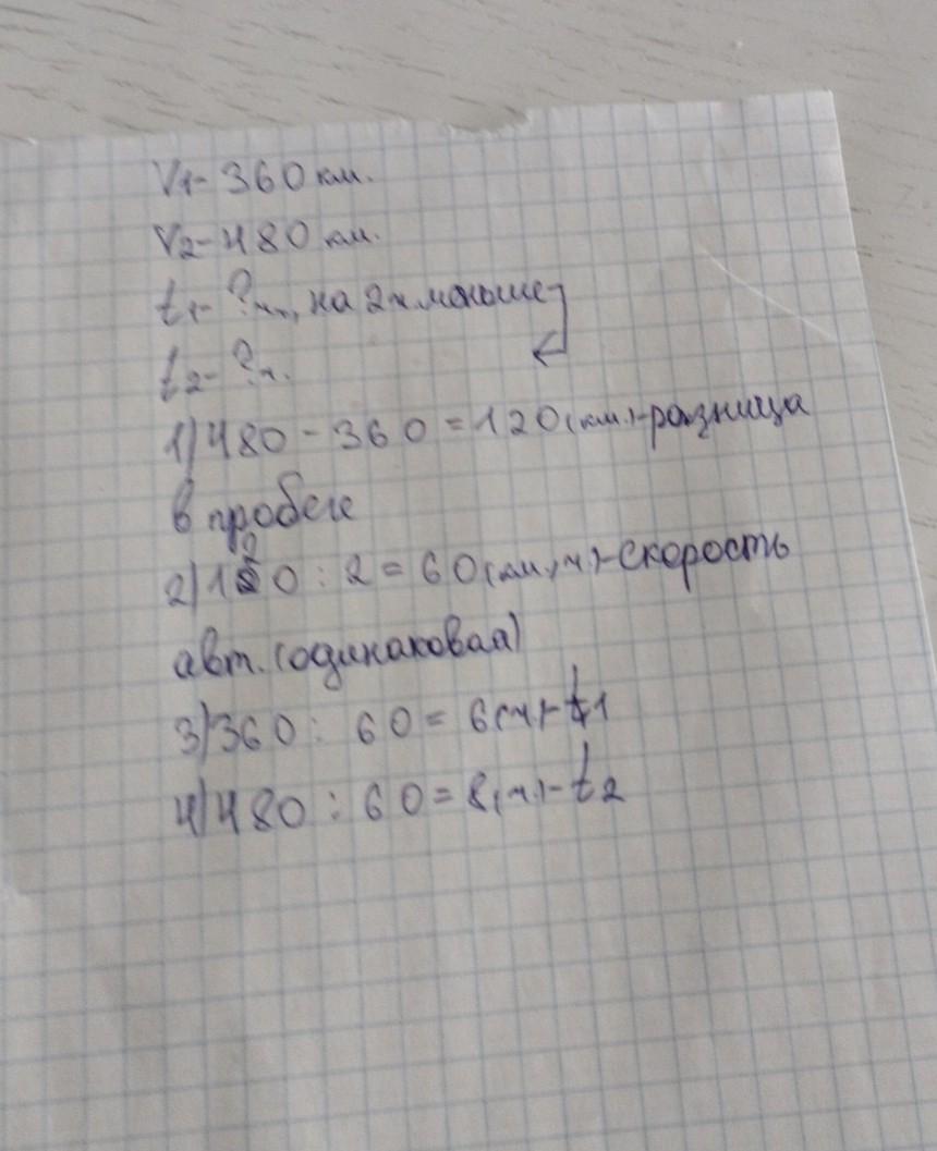 ДОМАШНЕЕ ЗАДАНИЕ 11 Реши задачу. Два автомобиля ехали с одинаковой скоростью. Один из них проехал 360 км, а другой - 480 км. Сколько часов был в пути каждый авто если первый был в пути на 2 часа мен ше, чем второй?(Можно пж с краткой записью )