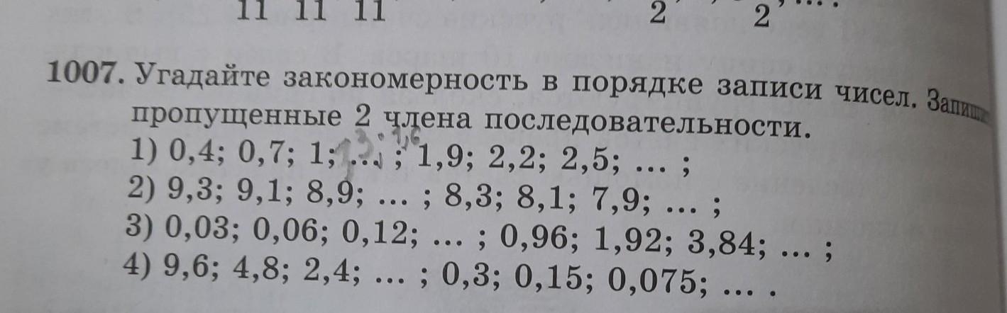 1007. Угадайте закономерность в порядке записи чисел. За пропущенные 2 члена последовательности. 1) 0,4; 0,7; 1;...; 1,9; 2,2; 2,5; ... ; 2) 9,3; 9,1; 8,9; ... ; 8,3; 8,1; 7,9; ...; 3) 0,03; 0,06; 0,12; ; 0,96; 1,92; 3,84; ...; 4) 9,6; 4,8; 2,4; ...; 0,3; 0,15; 0,075: ...