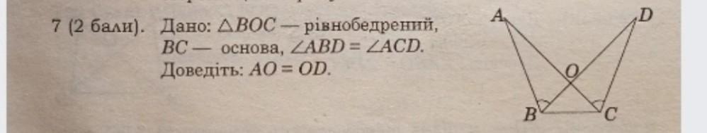 ΔАОВ=ΔDОС (∠АОВ=∠DОС як вертикальні, ∠АВD=∠АСD за умовою, ВО=ОС за умовою)
